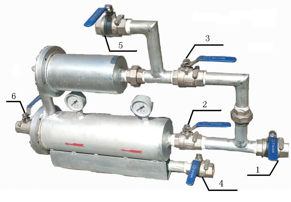 V、 主過濾器發(fā)生異常副過濾器正常工作:先后打開1、3號反沖洗閥門、6號出水口閥門;依次關(guān)閉2號進水口閥門、5號副過濾器排污閥門、4號主過濾器排污閥門,水由原水管道直接進入3號反沖洗閥門,經(jīng)過副過濾器過濾再由6號出水口閥門直接接入下一管道;副過濾器正常工作完成。
